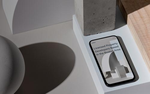 Upright smartphone displaying a mobile website, lined up alongside several blocks